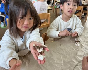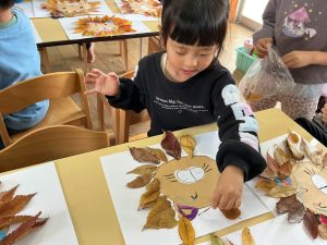 新着情報 2025.11.29 秋探し(ぱんだ組) 園庭に出掛けると落ち葉がいっぱい広がり、大喜びのぱんだ組でした。 葉っぱを拾い、製作をしました。 また別の日には、園庭に隠したキノコ見つけも楽しみました。 しいたけを使ったクッキングも行い、秋の自然に触れた11月でした。 前へ 一覧へ