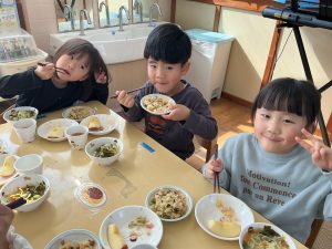新着情報 2026.02.18 お楽しみメニュー(2月誕生会)🎂 〈お楽しみメニュー〉 みそラーメン、チャーハン、キャベツとトマトのサラダ、りんご 〈おやつ〉 ジャムパン 以上児:ホットミルクティー 未満児:牛乳 チャーハンやラーメンを「美味しい」と言って幸せそうに食べる子ども達でした! 前へ 一覧へ