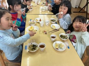新着情報 2026.03.11 お楽しみメニュー(3月誕生会)🌸 〈お楽しみメニュー〉 鮭おにぎり、わかめうどん、ツナきゅうりサラダ、りんご 〈おやつ〉 カルピス、フライドポテト 美味しそうに鮭おにぎりを食べる子どもたちでした! 前へ 一覧へ 次へ