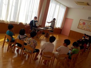 新着情報 2021.10.08 10月8日(金)英語あそび 年長児ぞう組は英語の先生と一緒に英語あそびを行いました。 「one two …ten」と数えたり、ひとりずつ「My name is ○○!」と歌にのせて名前を言う場面がありましたが、照れながらもみんなが発声できました。 前へ 一覧へ 次へ