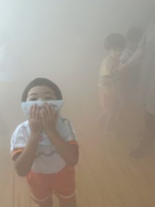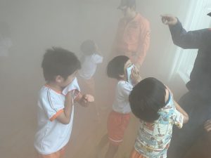 そして、今回の目玉はなんと煙体験!部屋の中が白い煙でいっぱいになり、前が全く見えない状態に…。