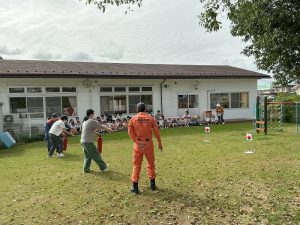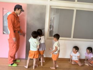 そのあとは、保育士による水消火器訓練も見学しました📣子どもたちも「がんばれ〜!」と応援してくれましたよ。