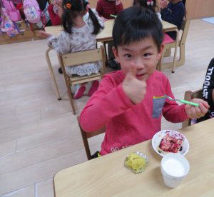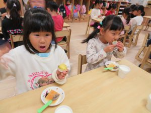 新着情報 2018.11.28 おいも商店街(ぞう組) ぞう組さんがおいも商店街を開きます。 まずはお店を出す準備です。 さつまいもを洗って、皮をむきます。 蒸しパンとスイートポテトを作ります。 さあ開店です。 おいも商店街は可愛いお客さんで、大忙しでした! 楽しかった商店街も終わり、やっと自分たちで作ったスイートポテトを食べました。 働いた後のおやつはとても美味しかったです。 働くって大変だね!ぞう組さん、お疲れ様でした! 前へ 一覧へ 次へ