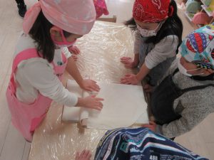 新着情報 2018.12.29 食育~うどん作り~(ぞう組) ぞう組さんの今年最後のおやつは、自分たちで作る手打ちうどんです。 小麦粉を混ぜて足で踏んでこしを出し、麺棒で薄く伸ばしてカットしました。 形はいろいろだけど、自分たちで作ったうどんは美味しかったです! 前へ 一覧へ 次へ