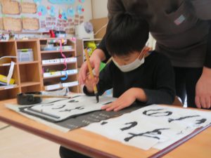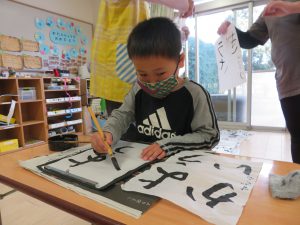 新着情報 2021.02.05 書道に挑戦(ぞう組) 絵画指導で墨を使って牛の絵と「うし」の文字を書いたぞう組の子どもたちが本格的なお習字に挑戦しました。 半紙には4つの部屋があること、書く文字数で描く場所が違うこと等の説明にしっかりと耳を傾けていました。 まず始めに、水で書ける紙に練習。事前に一人ひとり書きたい言葉を見本を見ながら練習しました。 いざ本番では、緊張しながらも丁寧に書く子、思い切ってダイナックに書く子、個性豊かでした♪ 前へ 一覧へ 次へ