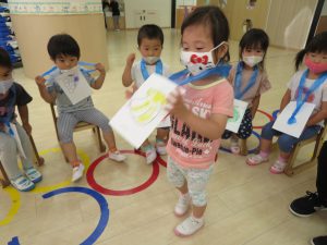 新着情報 2021.06.10 フルーツバスケット(うさぎ組) うさぎ組がフルーツバスケットをします。 りんごやバナナ、ぶどう、もも、メロンなど 好きな果物の絵を書き、首から下げて準備OK!! 少し恥ずかしそうに「フルーツバスケット🍑」。 恥ずかしがり屋さんが多いうさぎ組ですが、 みんな上手にできました!(^^)! 前へ 一覧へ 次へ
