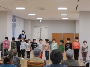 新着情報 2023.03.29 施設交流(5歳児) 今年度最後の施設交流を行いました。 卒園を控えたぞう組。 卒園式で行なうお別れの言葉と歌を披露しました。 最後に「おじいちゃん・おばあちゃんも元気でいてください。」 とメッセージをおくりました! デイサービスの利用者さんからは、手作りのストラップのプレゼントと 「小学校へ行っても頑張ってね!」と応援メッセージ。 子ども達は晴れやかな表情でした! 前へ 一覧へ 次へ