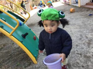 発表会で披露した劇、「ウシとカエル」の帽子を被ることが大好きな子どもたち。