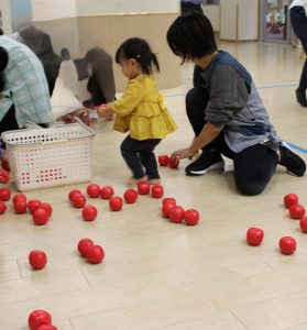 玉入れはお家の方に玉を渡してもらうと、自分で上手にかごの中に入れていました。