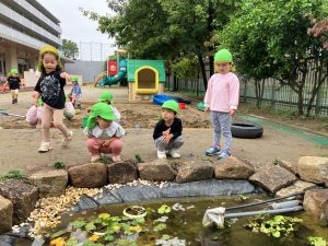池のメダカにも興味津々で、池のふちにお友だちと並んで座り、