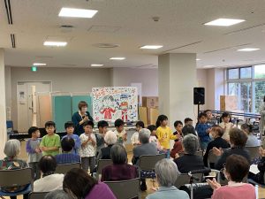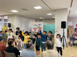 新着情報 2025.11.05 和音コンサート ぞうぐみ 併設の高齢者施設のデイサービスのイベント「和音コンサート」に参加しました。 素敵な歌声に、体を揺らしながら聞き入る子どもたち。 唱歌「紅葉」は知っているお友だちもいて一緒に歌ってくれました。 踊りを教えてもらい、一緒に歌いながら踊り楽しい時間を持つことができました。 前へ 一覧へ