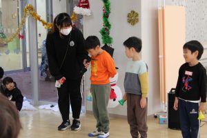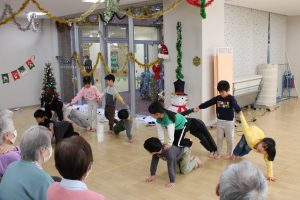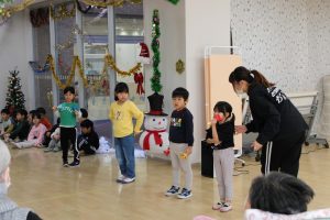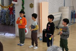 新着情報 2025.12.12 施設交流(ぞう組) 併設の施設ル・ソラリオン綾瀬のご利用者の方と施設交流をしました。 今回は5歳児ぞう組のお友だちが参加しました。 自己紹介をして、運動会で行った組体操と、ハンドベルを披露し、 最後は「ひまわりサン体操」を元気に踊る姿を見ていただきました。 おじいちゃんおばあちゃんから、「とても上手でした」と一足早いクリスマスプレゼントをもらい嬉しそうな子どもたちでした。 前へ 一覧へ