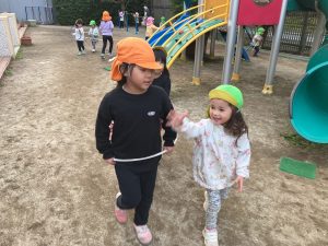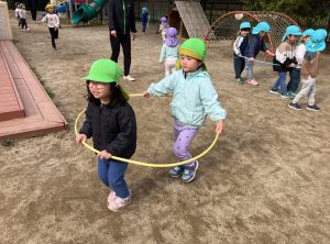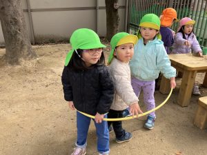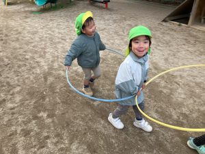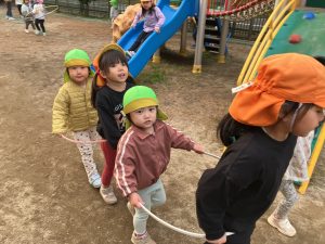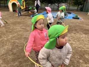 新着情報 2025.12.22 電車ごっこ(あひる組) 1つのフラフープの中に入り、「ガタンゴトン」と 友だちと電車ごっこを楽しんでいます。 「お山駅」「お池駅」など、園庭の遊具や築山、池を駅に見立て、 「乗りますか?」「発車しまーす。」とやりとりも嬉しそうです。 子どもたちのにぎやかな笑い声がとても可愛らしいです。 前へ 一覧へ