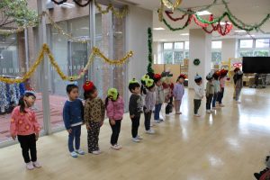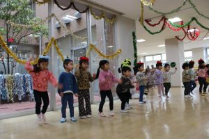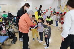 新着情報 2025.12.22 施設交流(うさぎぐみ) 併設の施設ル・ソラリオン綾瀬のご利用者の方と施設交流をしました。 今回は3歳児うさぎ組のお友だちが参加しました。 自己紹介をして、「やまのおんがくか」の歌を歌い、「かみなりビリビリ」と「フルーツポンチ」の踊りを披露しました。 おじいちゃんおばあちゃんに「かわいいね。上手だったよ。」と沢山褒めてもらい、クリスマスプレゼントと綺麗な千羽鶴をもらいました。 最後は一人ひとりと握手をして、お話をして楽しい時間を過ごしました。 前へ 一覧へ