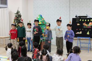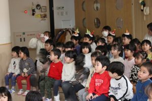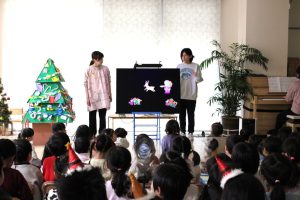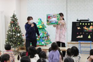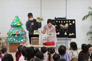 クリスマスのテーマのブラックパネルシアターは子どもたちも一緒に「赤鼻のトナカイ」と「ジングルベル」を一緒に歌いながら楽しみました。最後に「メリークリスマス」という文字がパッと出てくると「魔法みたい!」と目をキラキラさせていました。