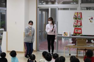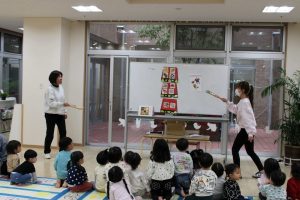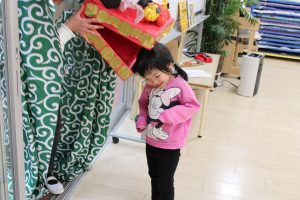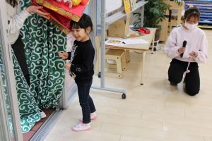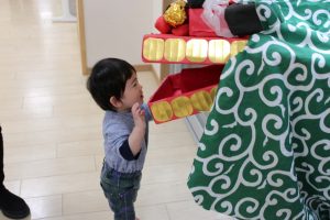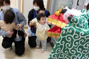 最後は獅子舞が光庭に登場です。怖くない子どもたちは獅子舞に頭を噛んでもらいました。年齢が上がるにつれて「噛んでもらいたい!」と順番を待つ子も増え、獅子舞による邪気払いで、子どもたちの健やかな成長を願うひとときになりました。