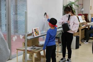 福笑いはぞう組のお友だちが前に出てきて、目隠しをして行いました。