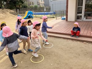 新着情報 2026.01.28 集団遊び(きりん組) 氷鬼やリレーなど、皆んなで遊ぶ姿が 多くみられるようになってきました。 子どもたちでルールを考えたり、 チームを決めたりして楽しんでいます。 前へ 一覧へ 次へ