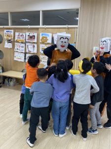 覆面を被ったお母さんと保育士たちが、質問に答えたり、ジェスチャーをしたりして子どもたちに「誰でしょうクイズ」をしました。