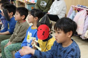 ぞう組のお友だちは自分たちで作った冠や烏帽子をかぶって参加してくれた子もいました。