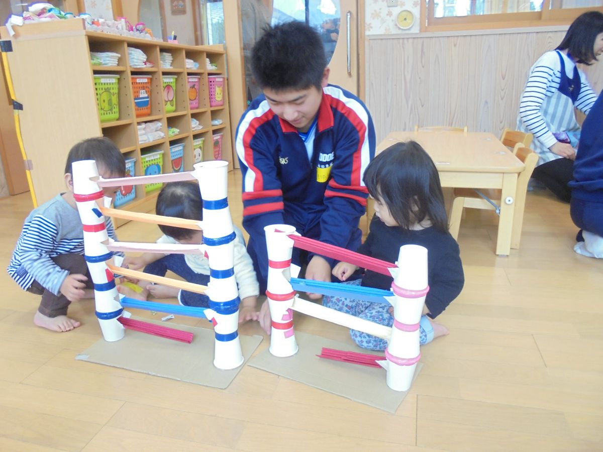 新着情報 2017.11.15 淀江中学校 ふれあい体験 11月15日 13名の淀江中学校のお兄さん、お姉さんが園児のために手作りの遊び道具を持って保育園にやって来ました。どのおもちゃも各年齢の園児が楽しめるようにいろいろと工夫されているのがよくわかるものばかりでした。ホースの中に小さな玉がたくさん入っています。傾けたり振ったりして遊びました。 コップを手前に引っ張るとコロコロと前進します。 箱の中に棒を差し込むと何が出てくるかな? ビー玉が右へ左へと坂を下っていきます。 バイクに乗ってライダー気分! 前へ 一覧へ 次へ
