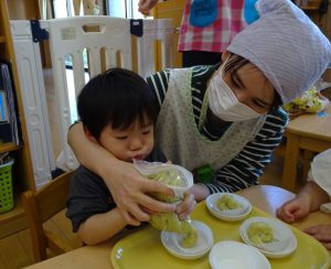 みんなで順番に「モミモミ」と言いながらおいもを潰し、