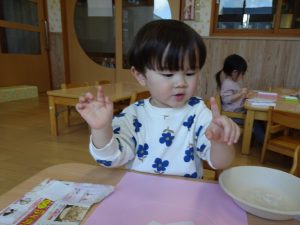 「1だよ」と人差し指にのりをつけることを伝えると、