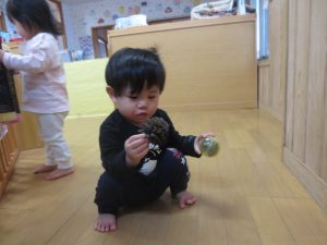 また、お部屋では、どんぐりマラカスや落ち葉のマットを使って、