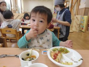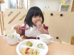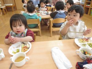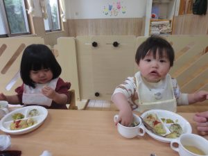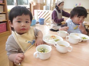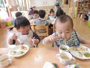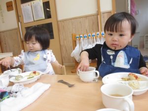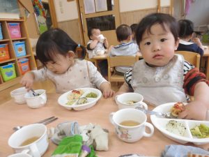 食事の時間が大好きなひよこ組の子どもたち。