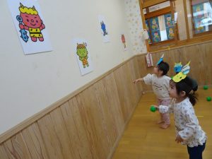 会の後は、クラスで豆まき(ボール)をしました。