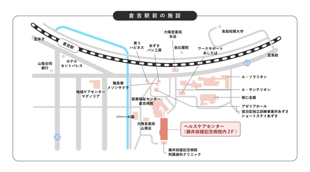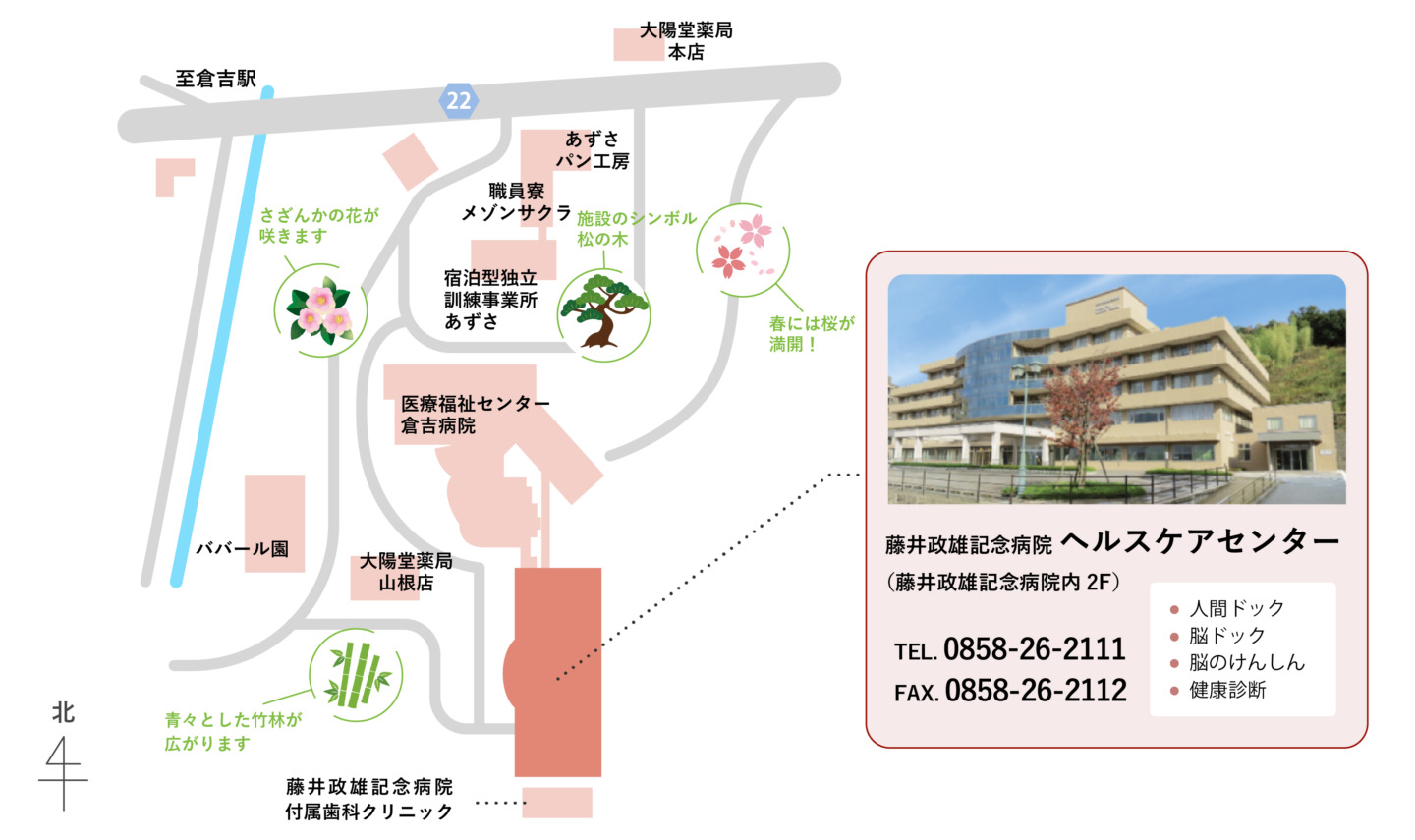 HOME > ヘルスケアセンターについて > 施設のご案内 施設のご案内 交通アクセス Access アクセスマップ Floor Map 館内マップ 地図 所在地 〒682-0023 鳥取県倉吉市山根43-1電話 0858-26-2111 倉吉駅前の施設 交通アクセス お車でお越しの場合 はわいICより約15分倉吉駅より約3分 JRでお越しの場合 JR倉吉駅下車徒歩約7分・タクシー約3分 バスにて山根パープルタウン前停留所下車徒歩7分 周辺地図 当センターへのお問い合わせやご質問、ご相談などございましたらご連絡ください。 お電話でのご予約・ご相談 TEL 0858-26-2125 FAXでのご予約・ご相談 FAX 0858-48-9003 予約フォーム MAIL 予約フォームへ 人間ドック 人間ドックのご案内 脳ドックのご案内 『脳のけんしん』のご案内 オプション検査 検査項目 健診前にお読みください 健康診断 協会健保生活習慣病予防健診 特定健診 企業健診 健診前にお読みください ヘルスケアセンターについて ヘルスケアセンター概要 当センターの特色 施設のご案内 交通アクセス フロアマップ プライバシーポリシー 新着情報 お問い合わせ