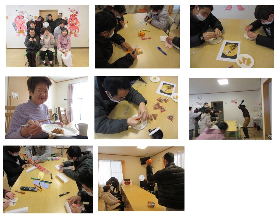 新着情報 2026.02.21 【グループホーム琴浦】節分行事 寒さの厳しい2月8日(日)に、グループホーム琴浦で「節分行事」を行いました。 ご利用者の皆さんが画用紙を使い鬼の顔を書く作品作りに参加されたり、 鬼の絵パーツを施設内で探すゲームでは、全員で協力しながら鬼を完成させました。 午後からは、チョコレートペンを使い ロールケーキに鬼のイラストを書いて、おやつの時間に食べました。 豆まきでは、「福は内、鬼は外」の掛け声に豆を投げて、 鬼を退散させる様子にグループホーム琴浦に福がくる!と大満足されていました。 前へ 一覧へ 次へ