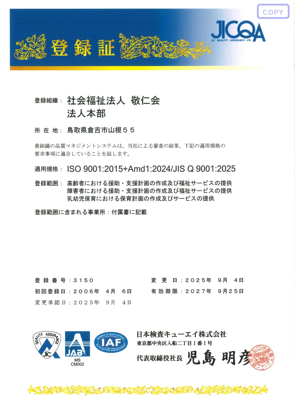 平成15年10月23日、社会福祉法人敬仁会は「ISO 9001」の認証を取得いたしました。