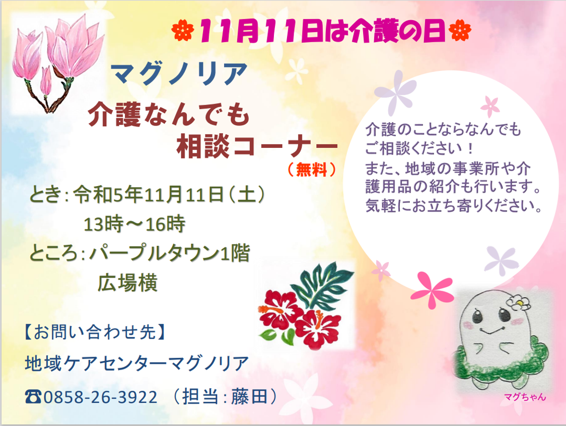 11月11日(土) 13~16時 パープルタウンにて「介護なんでも相談コーナー」を開催します。
