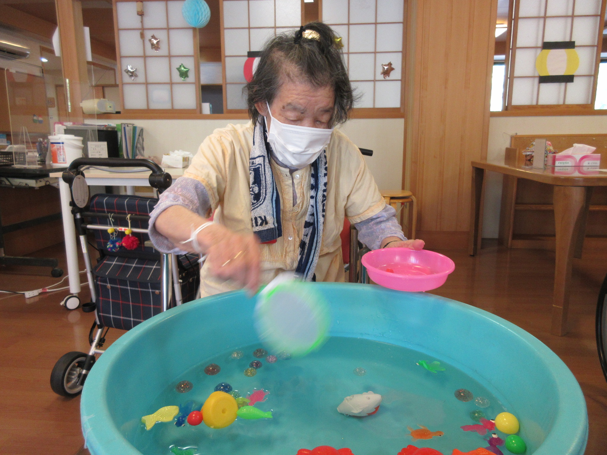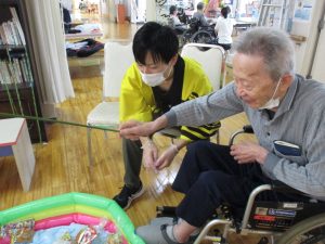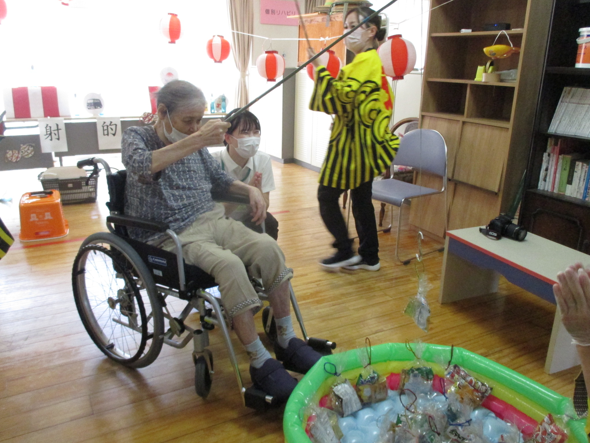新着情報 2024.08.26 夏祭り(療養課・通所リハビリ) サンテリオンで夏祭りを行いました。夏は暑いですが、夏祭りの楽しさは昔から変わりません。 射的、金魚すくい、お菓子すくいなどのゲームやかき氷などの冷たい物を楽しんでいただきました。射的では皆さん真剣な表情で的をねらって当てられていました。 金魚すくいでも真剣なご様子でポイが破けないよう慎重にされていました。 とても楽しい雰囲気で夏祭りが行なえ、笑顔や笑い声が多く見られました。お祭りでエネルギーをもらってこの夏も元気に過ごせそうです。 前へ 一覧へ 次へ