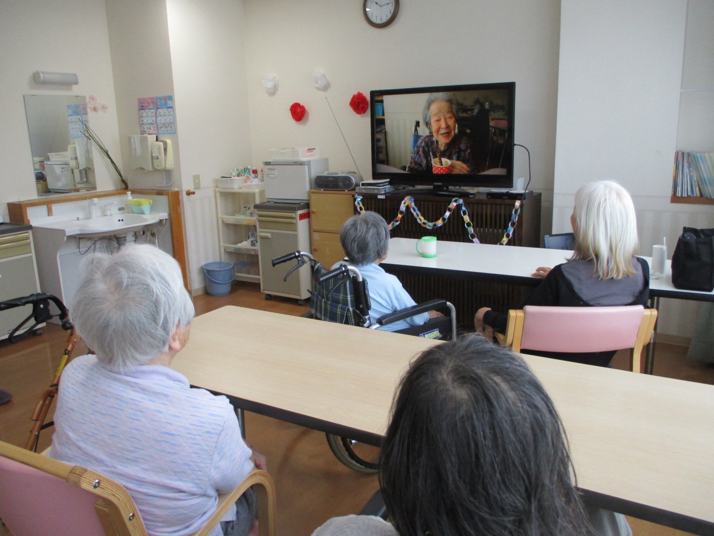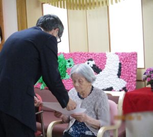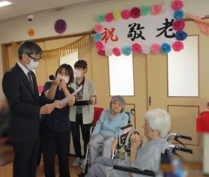 新着情報 2025.09.30 敬老会 敬老会を行いました。 御年101歳になられる方もおられ表彰式に参加されております。 表彰式の後は、皆様でスライドショーをご覧になられました。 自分が映ると少し恥ずかしそうですが嬉しそうなご様子で「私が映ってる。こんなこともしたわね。」と思い出されていました。 その後は、和菓子を召し上がられ「美味しい。」と好評でした♪ 前へ 一覧へ 次へ