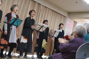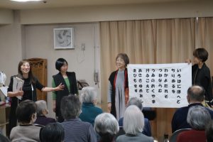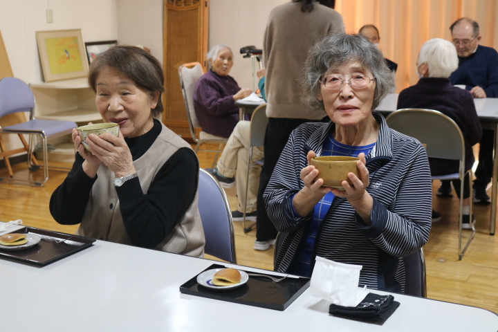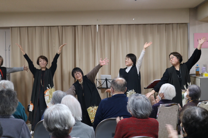 新着情報 2026.01.30 サンフラワーカフェ開催 今月も先月に続き「A-にょばりーと」の皆さんに来て頂き、歌のコンサートを行いました。 冬の歌や馴染みの歌を一緒になって歌ったり、A-にょばりーとさんの動きに合わせて一緒に腕をあげられたり手拍子をされたりと楽しみながら身体をたくさん動かされていました。 「楽しかった。」「歌ってやっぱり良いね。」と言われる方が多くアンコールが飛び交いアンコールまでして下さり大盛り上がりでした♪ コンサートの後は抹茶とどらやきを召し上がられ「抹茶久しぶりに飲んだわ。美味しい。」と好評でした。 前へ 一覧へ