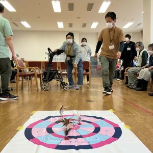 ご利用者、地域の混合チームで競技を行い、「ボッチャ」ではボールの転がりに一喜一憂、「羽根っこゲーム」では20点の高得点‼ 拍手喝采の大変楽しい時間でした。