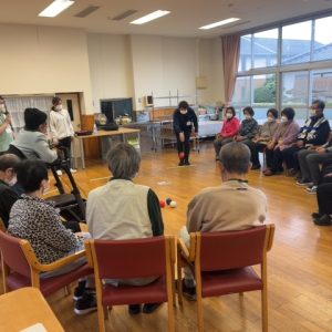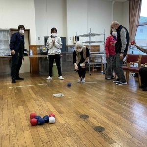 10/22(水) 福庭・清谷地区の地元の方が利用者との交流に来所され、ご利用者と一緒に「ボッチャ」「羽根っこゲーム」を楽しみました。
