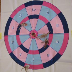 「羽根っこゲーム」重しのついた羽根を的に投げ合計得点を競うゲーム