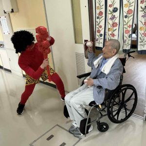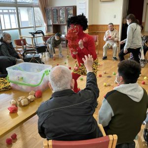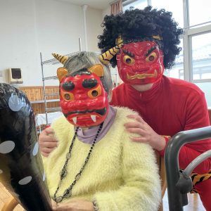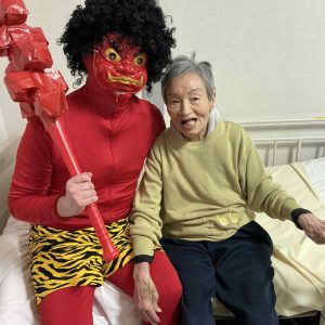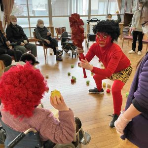 新着情報 2026.02.05 節分行事「鬼は外 、福は内‼」 2月2日(月)に節分行事を行いました。 施設には大暴れする赤鬼が登場し、参加者の皆さんは「鬼は外、福は内‼」の掛け声とともに玉を投げ、会場は賑やかな声と笑顔に包まれました。 会場に来られなかった方のために、赤鬼が各居室を訪問しました。突然の赤鬼の登場に、思わず力いっぱい玉を投げる場面も見られましたが、職員の扮装だと分かると、皆さんホッとした表情で笑顔に。 シルバー倉吉にたくさんの福が訪れる、楽しい節分行事となりました。 前へ 一覧へ