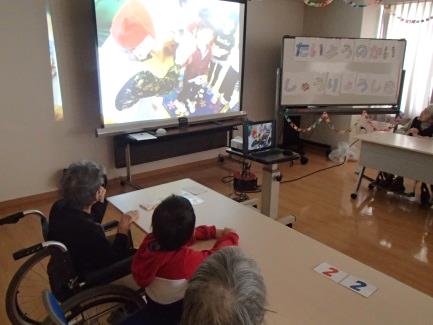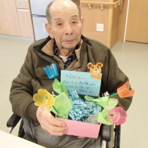 この日が今年度最後の会であったため、まとめの会として今年1年間の交流の様子を子どもたちと一緒にスライドを見ながら振り返った後、ご利用者の皆様より一言メッセージを書き添えた感謝状とささやかなプレゼントをお渡しさせて頂きました。そのお返しに子ども達からは肩たたきや手作りのお花の作品をプレゼントしていただき、元気いっぱいのダンスも披露してくれました。