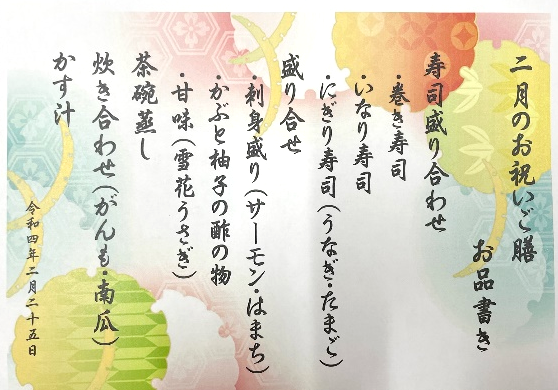 2月のお祝いご膳はご利用者様よりリクエストが多く、嗜好調査でも人気メニューの、寿司・刺身・茶碗蒸しを勢ぞろいさせた豪華なご膳は、皆様に大変喜んでいただけました。