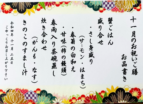 11月25日の昼食時に11月のお祝いご膳を提供させていただきました。