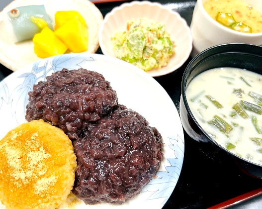 皆様からリクエストの多い手作りおはぎのバイキングをメインに、5月に旬を迎え6月が名残のそら豆やわらびを使って白和えとかす汁に、冷たい茶碗蒸しには梅あんをかけてさっぱりと、今が旬のジューシーなパイナップルに鯉のぼりのおまんじゅうを添えて、5月も6月も楽しめるご膳に仕上げました。