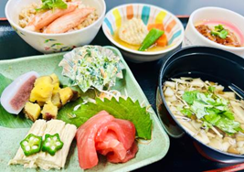 4月から10月は給食での刺身の提供はお休みしているため、半年ぶりにマグロのお刺身を楽しんでいただきました。その他、シーズン到来の蟹ごはん、うなぎの茶碗蒸し、うま味たっぷりのきのこ汁、湯葉のお浸し、春菊の白和え、そしてデザートにはやわらか大福に紅あずま芋添えと豪華な品々が盛りだくさんのご膳です。