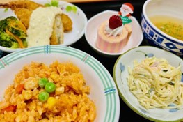 新着情報 2025.12.26 「クリスマスメニュー」 12月25日の昼食はクリスマスメニューをご用意させていただきました。 メニューは、ちょっと甘めに仕上げたチキンライス・ソラリオン特製のタルタルソースをたっぷりかけたフライ盛り合わせ・スパゲティサラダ・コンソメスープ、に加えてクリスマスのデコレーションしたロールケーキです。ケーキを召し上がるのが難しい皆様へはホイップクリーム&サンタさんでデコレーションしたプリンを提供させていただきました。 皆様には大変好評で、クリスマス気分を楽しんで頂くことができました。 前へ 一覧へ