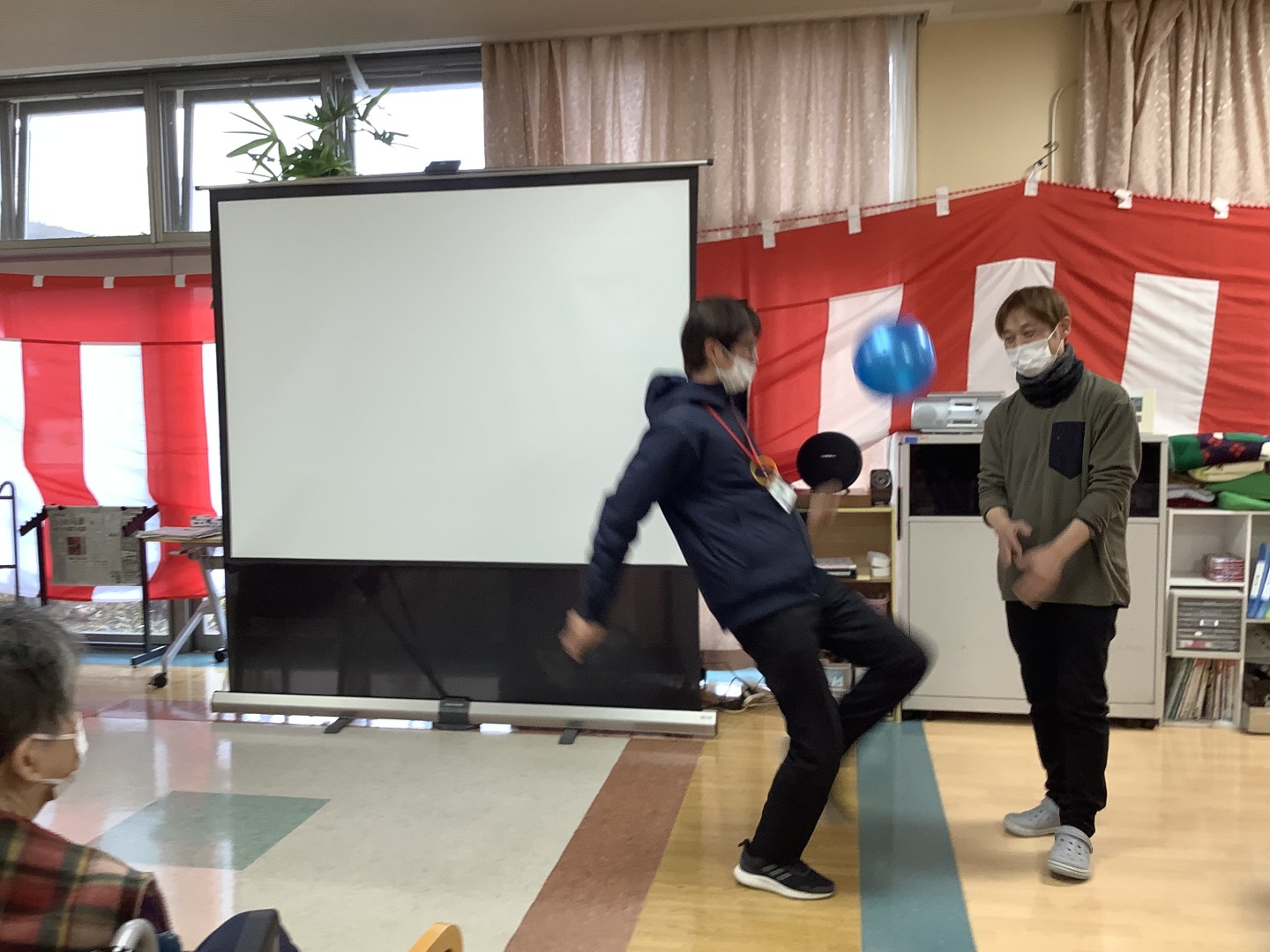 1月21日通所リハビリで新年会行事を開催しました。職員の出し物やお茶を点ててご利用者に振る舞いました。「とても楽しかったです。」と喜んでいただけた会となりました。