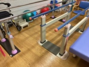 こちらの平行棒では手すりを持った状態で安全に立つ練習や歩く練習を行うことができます。