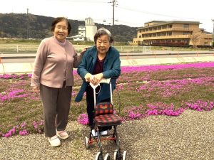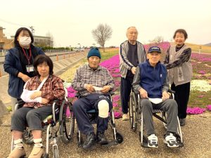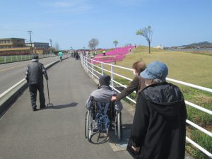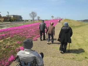 今年も東郷池のまわりに色とりどりの芝桜が咲き始めました。 お天気にも恵まれ,利用者さんと一緒に春の風を感じながら、のんびりとお散歩を楽しみました。 満開の芝桜を眺めて、みなさん自然と笑顔に♪春のひとときを満喫しました。